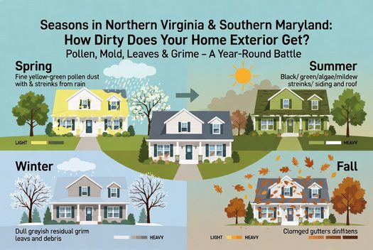 What season is worst for home exterior contamination in Northern Virginia? Spring. Heavy regional pollen coats every surface from late February through May, bonds to siding and roofing when wet, and feeds mold and algae growth if not removed promptly.
